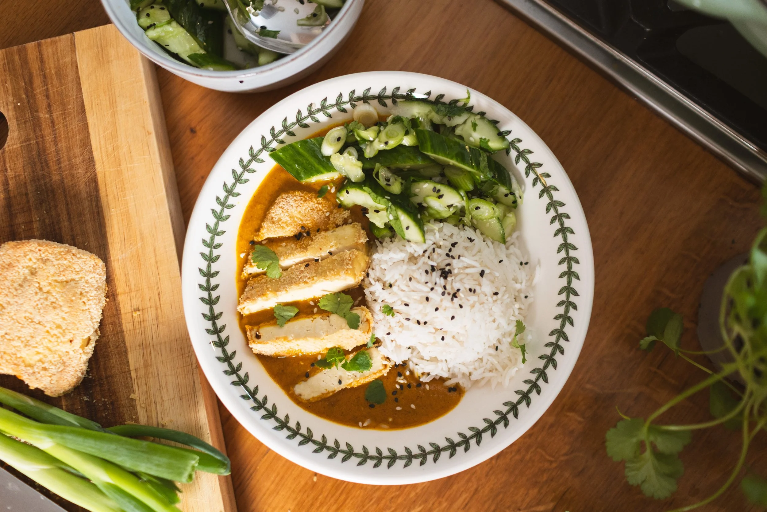Almond Crust Tofu, Katsu Curry & Smashed Cucumber Salad (Gluten Free & High in Fibre): Serves 2