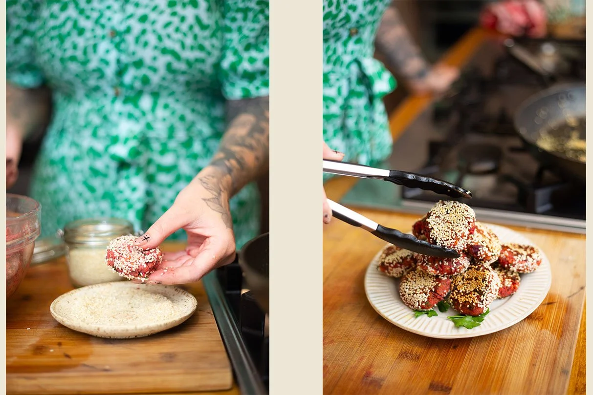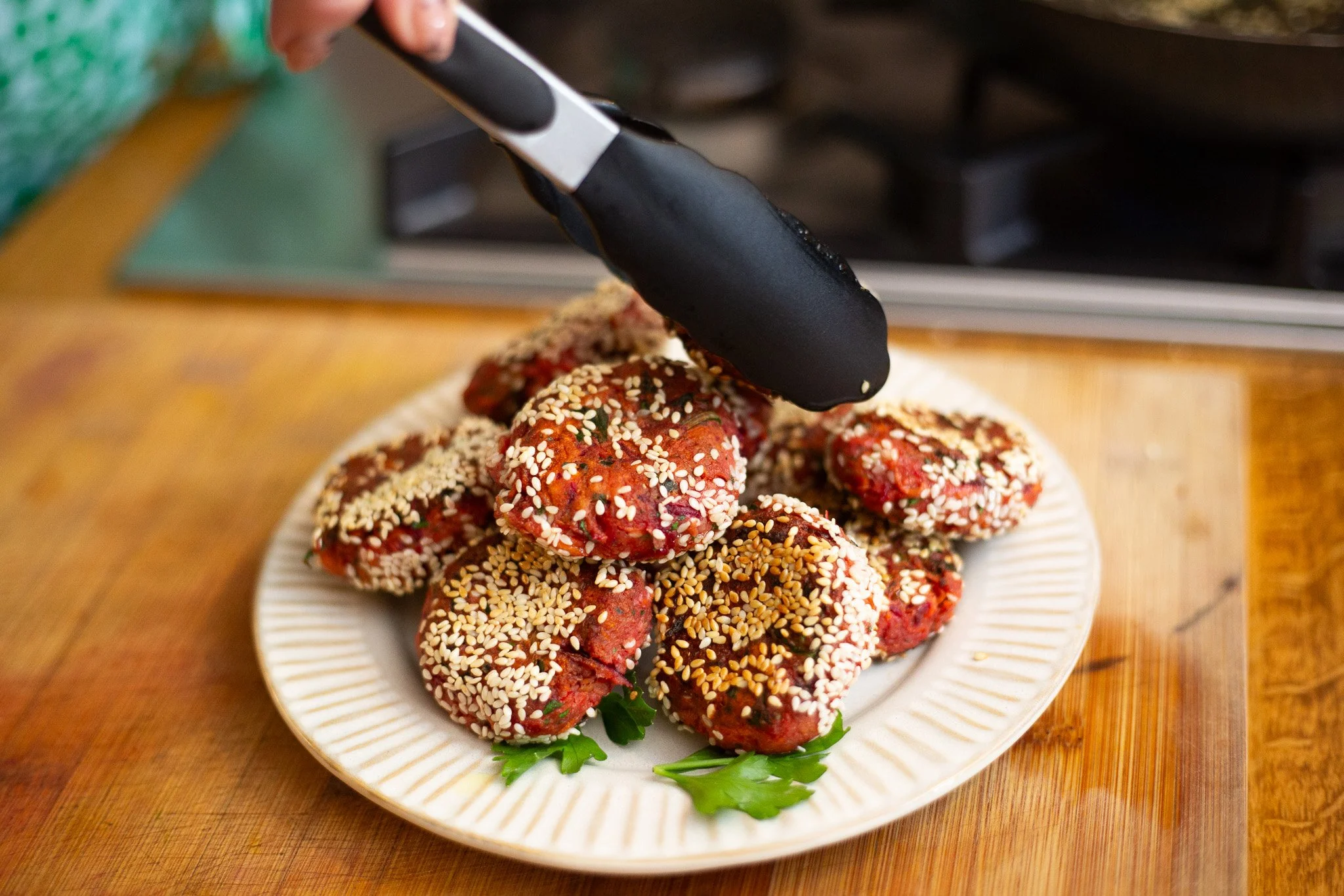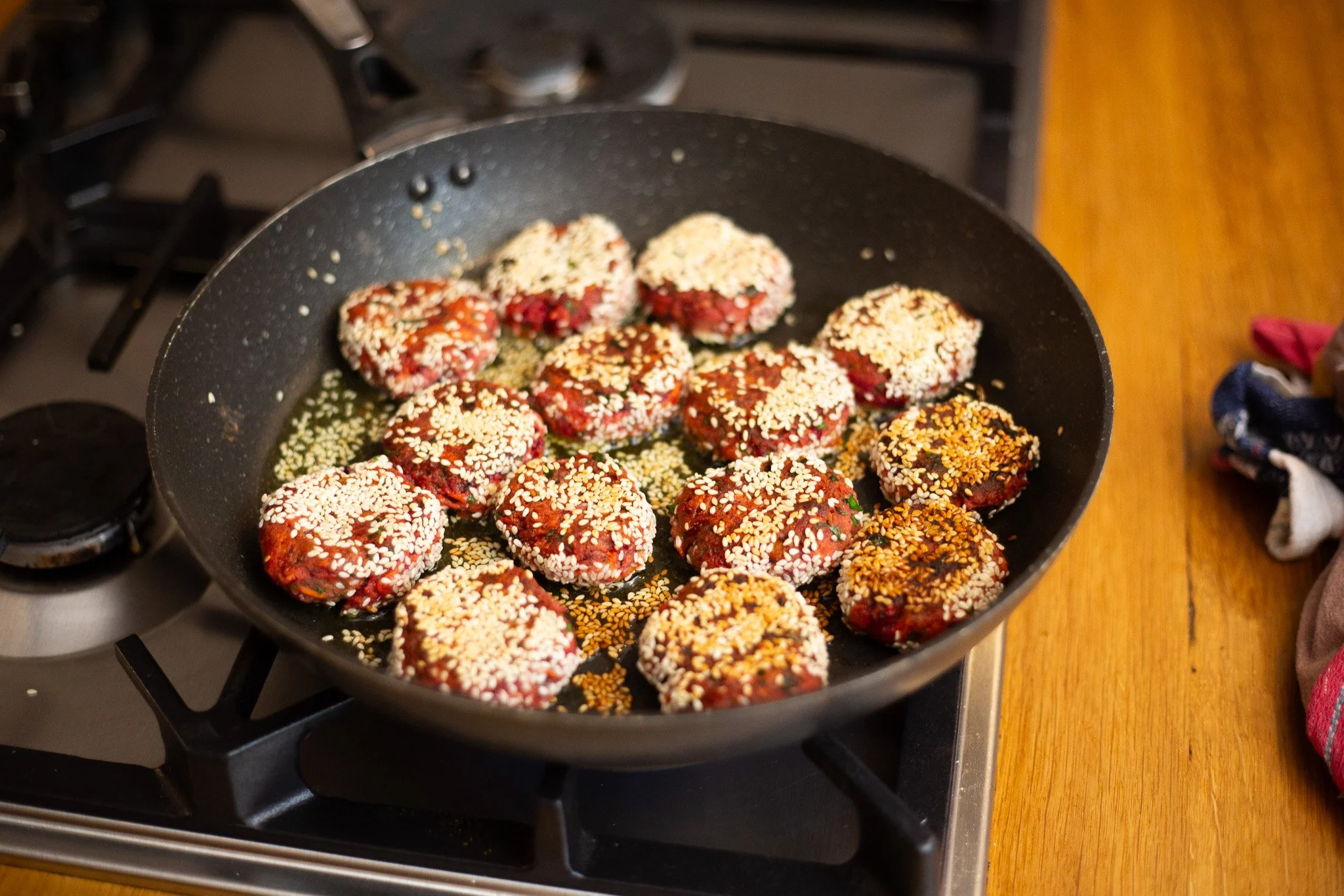 Fill a shallow dish with sesame seeds and roll the patties in the sesame seeds to coat them.