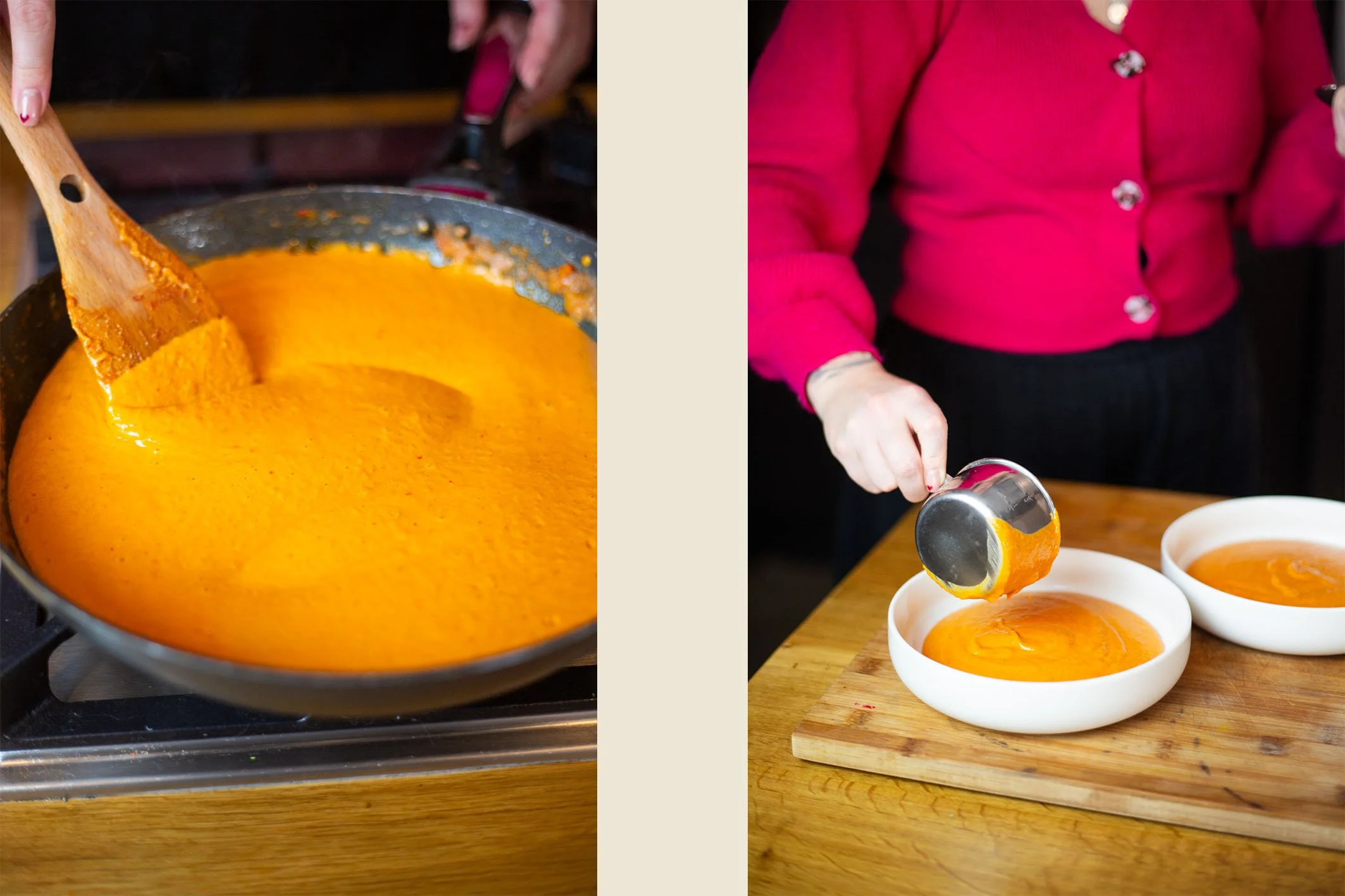 The sauce is made from all the best things, harissa paste, coconut, peanut butter, tomato and maple with a classic base of onions and garlic. This sauce is blended until smooth, which is optional but i find it really lets the roasted veg sing if it is blended and the flavours feel more complete.
