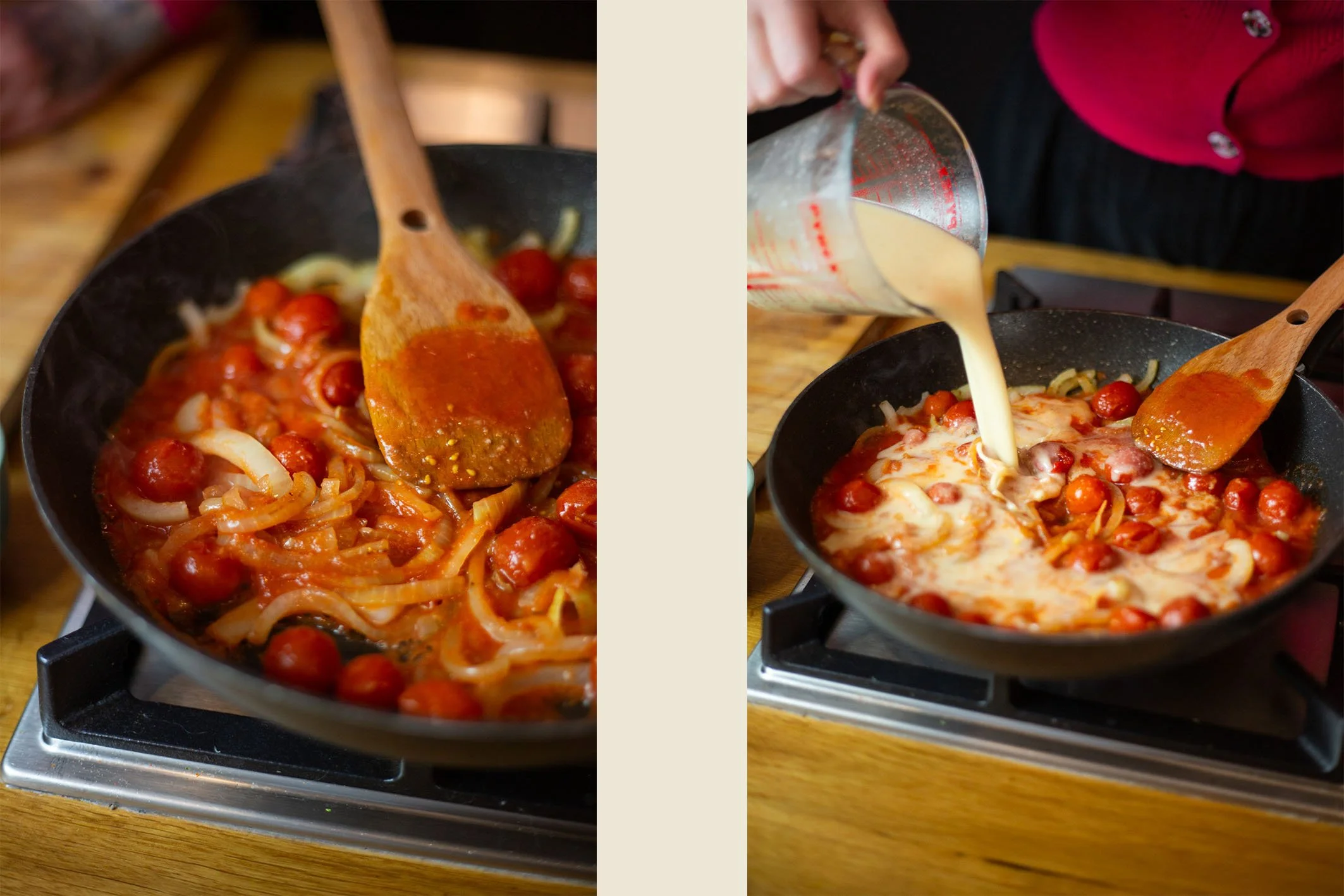 Return to the stew in the hob. Add the tin of tomatoes and coconut milk from your jug to the pan, and stir and simmer on a medium heat for 5 minutes.