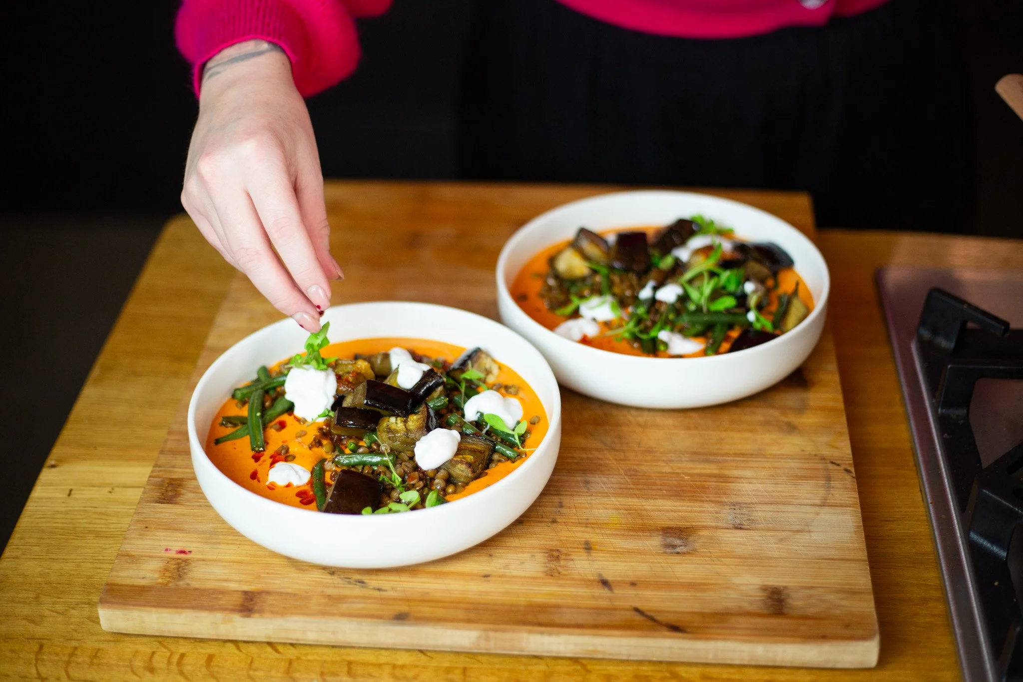 Return the sauce to your pan to warm through. Once hot, divide into 3 shallow bowls and top with roasted aubergine, green beans and lentils.