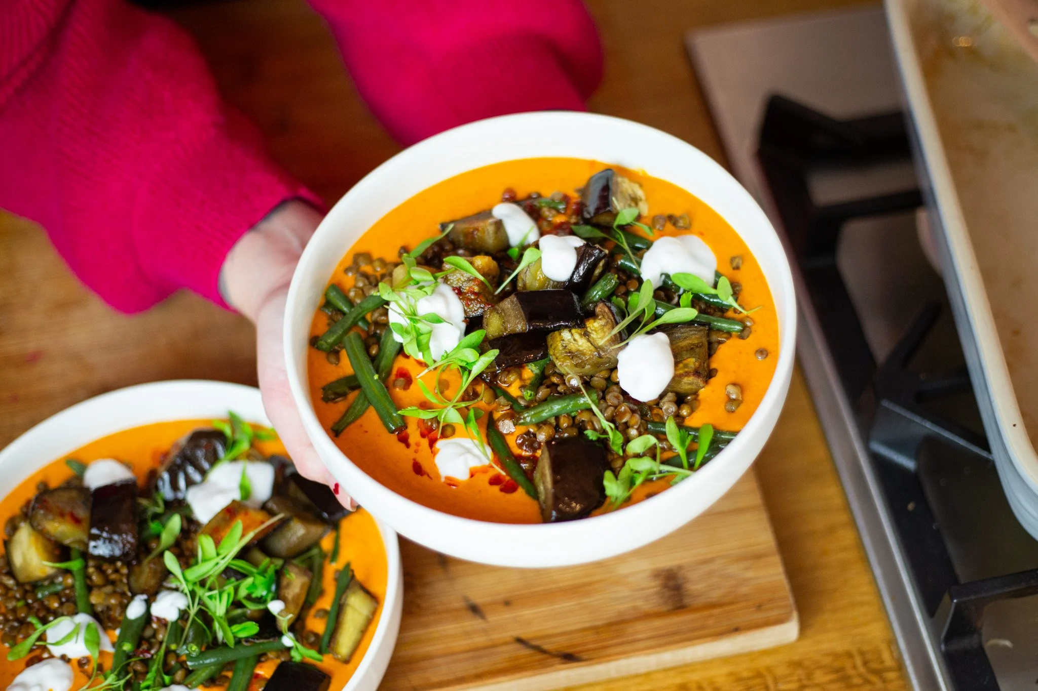 Harissa Coconut Stew with Maple Roasted Aubergine, Green Beans and Lentils