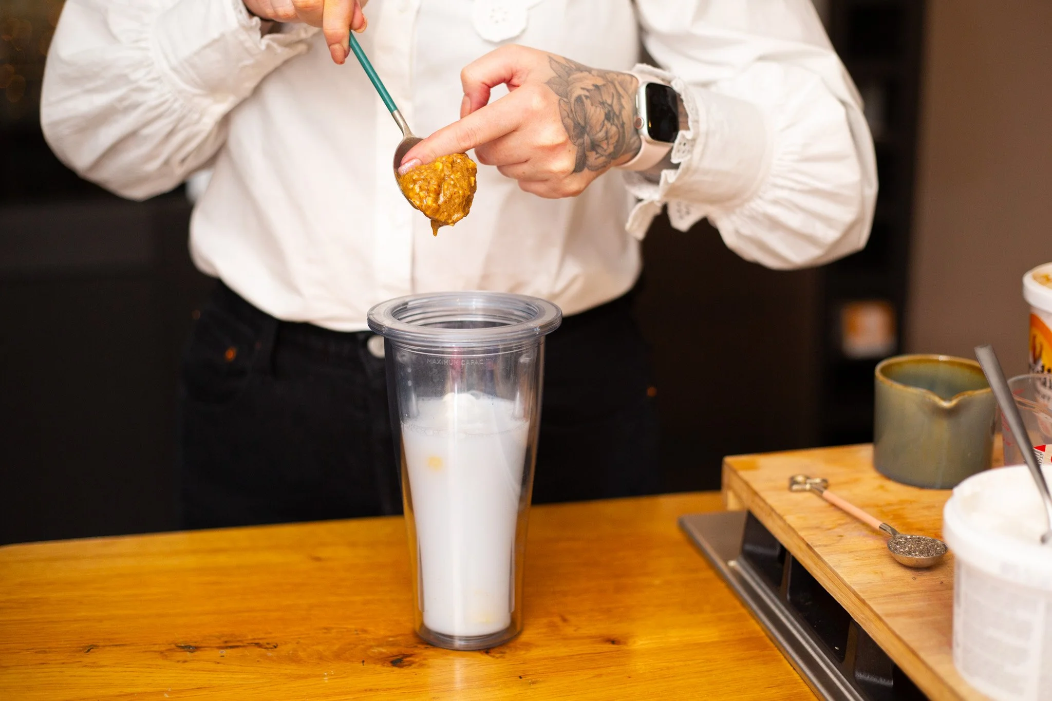 Pour into a tall glass of your choice and garnish with whatever you like! We recommend a couple of blueberries, a drizzle of peanut butter or even some edible flowers!