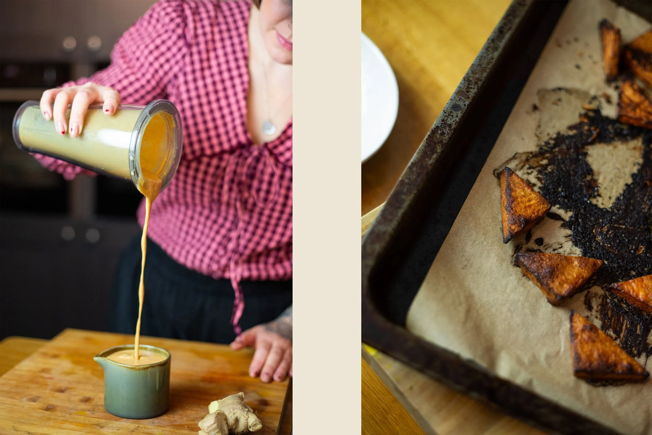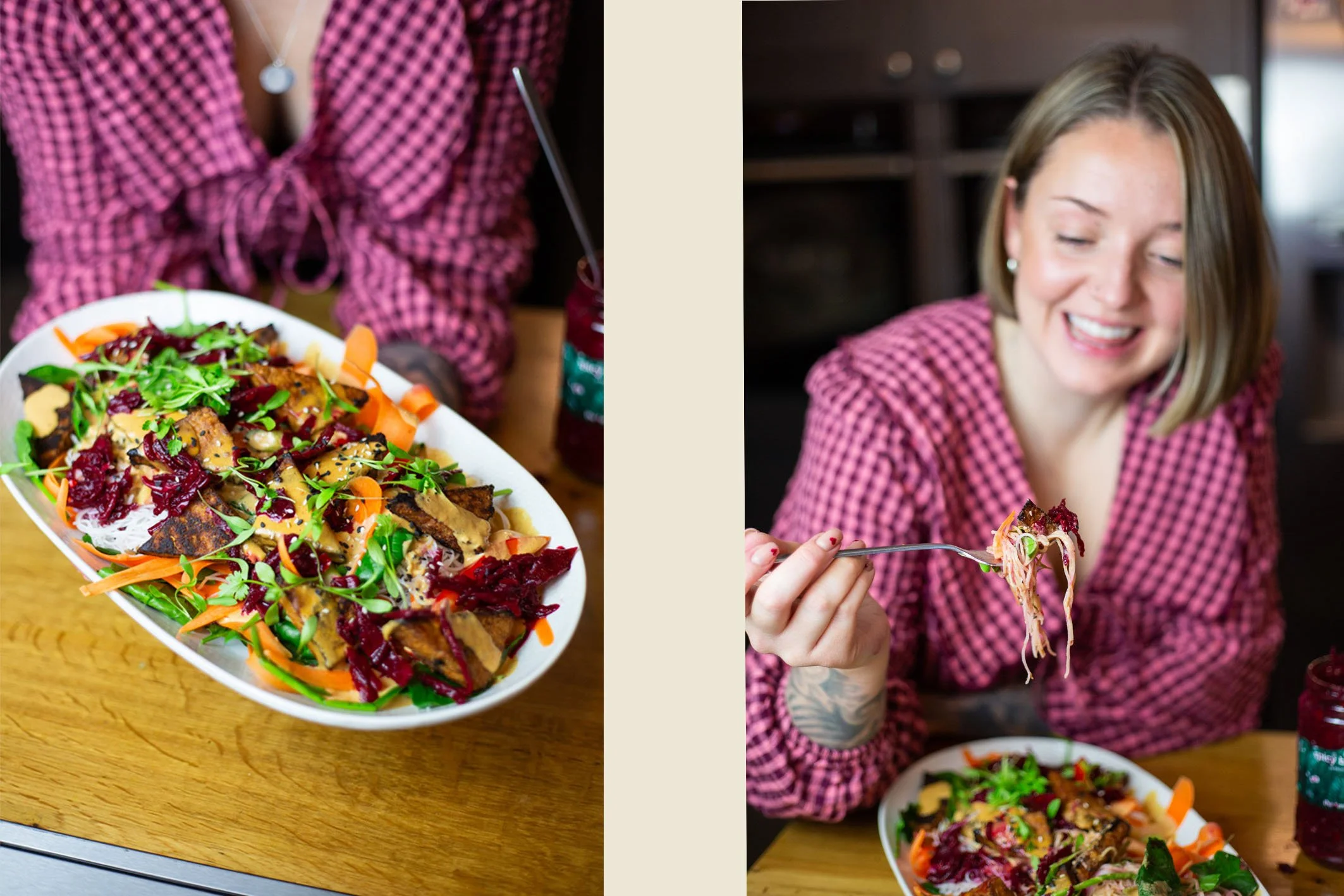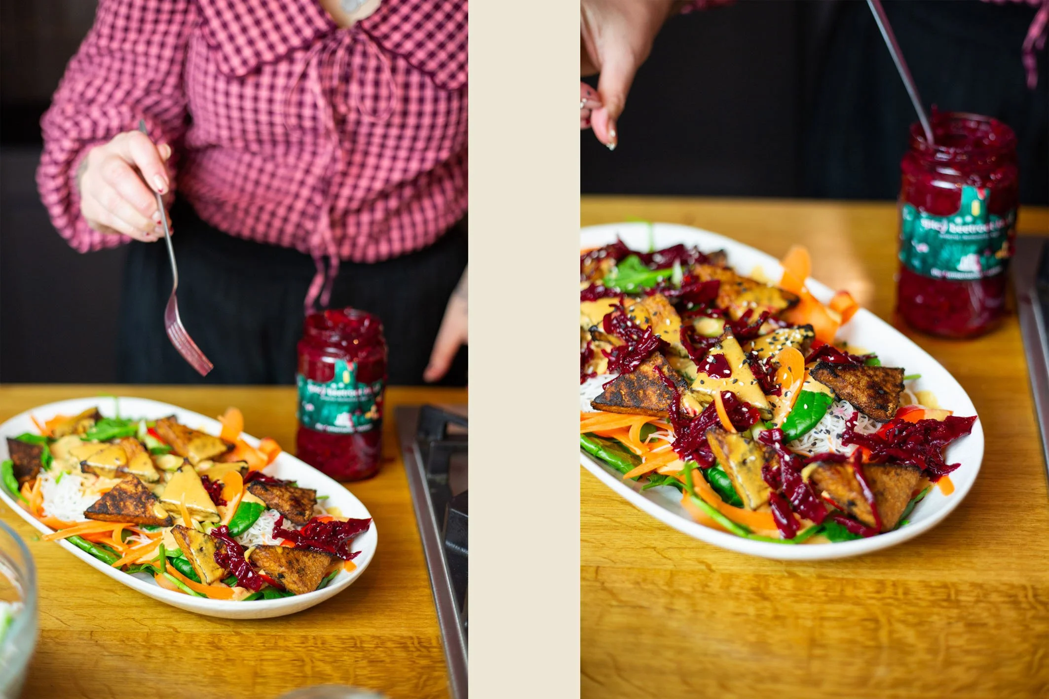 We start by marinading the tempeh and baking in the oven whilst we crack on with the salad. This salad is so nutritionally dense, packed with protein from the tempeh and gut loving bacteria from the beetroot kraut. This is one of those salads that we make in the cafe and is gone in an instance, so now you can make this variation at home too.