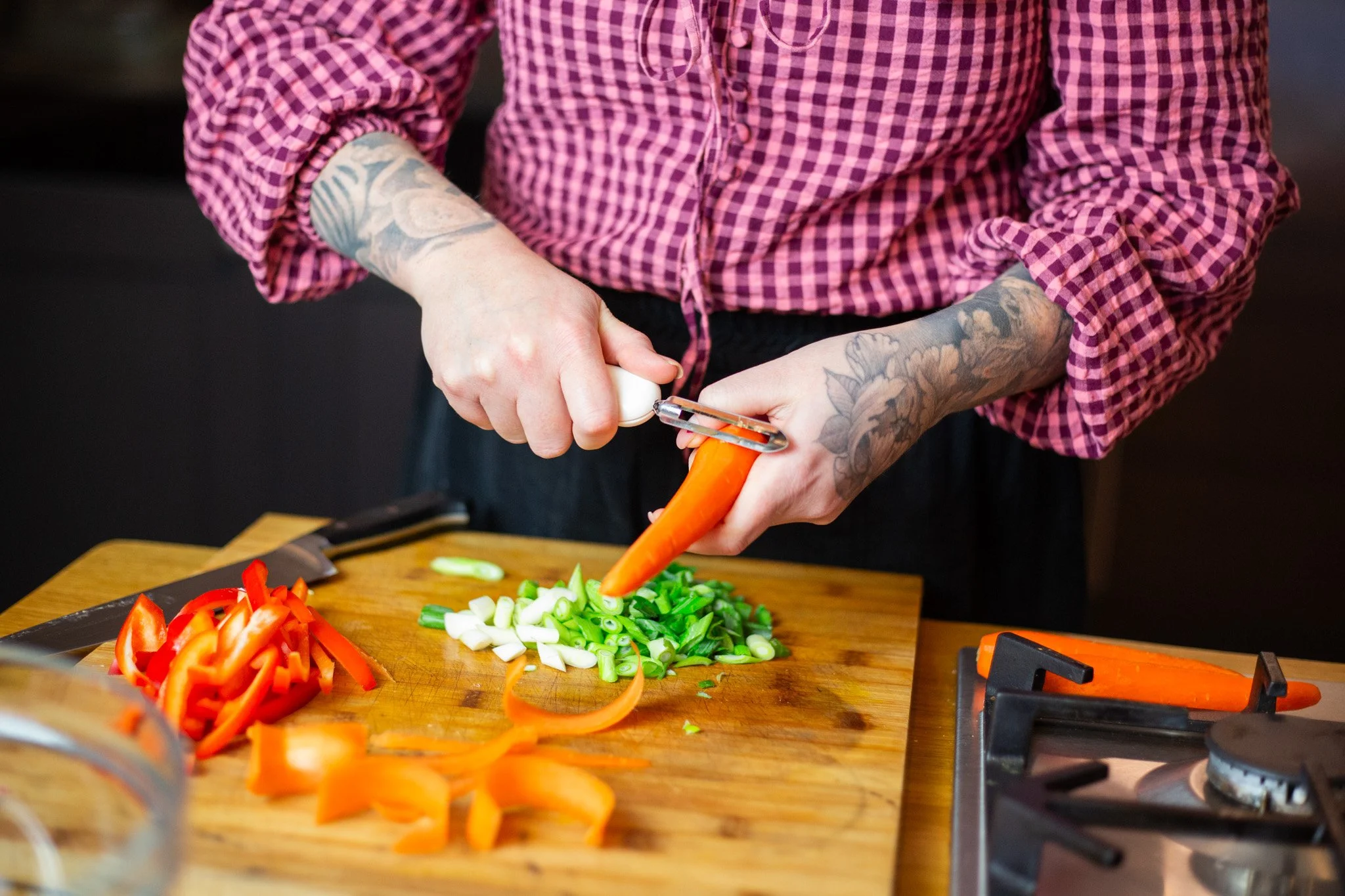 Time to prep the veg! Slice the pepper, use a peeler to create carrot ribbons and slice the spring onion into small pieces.