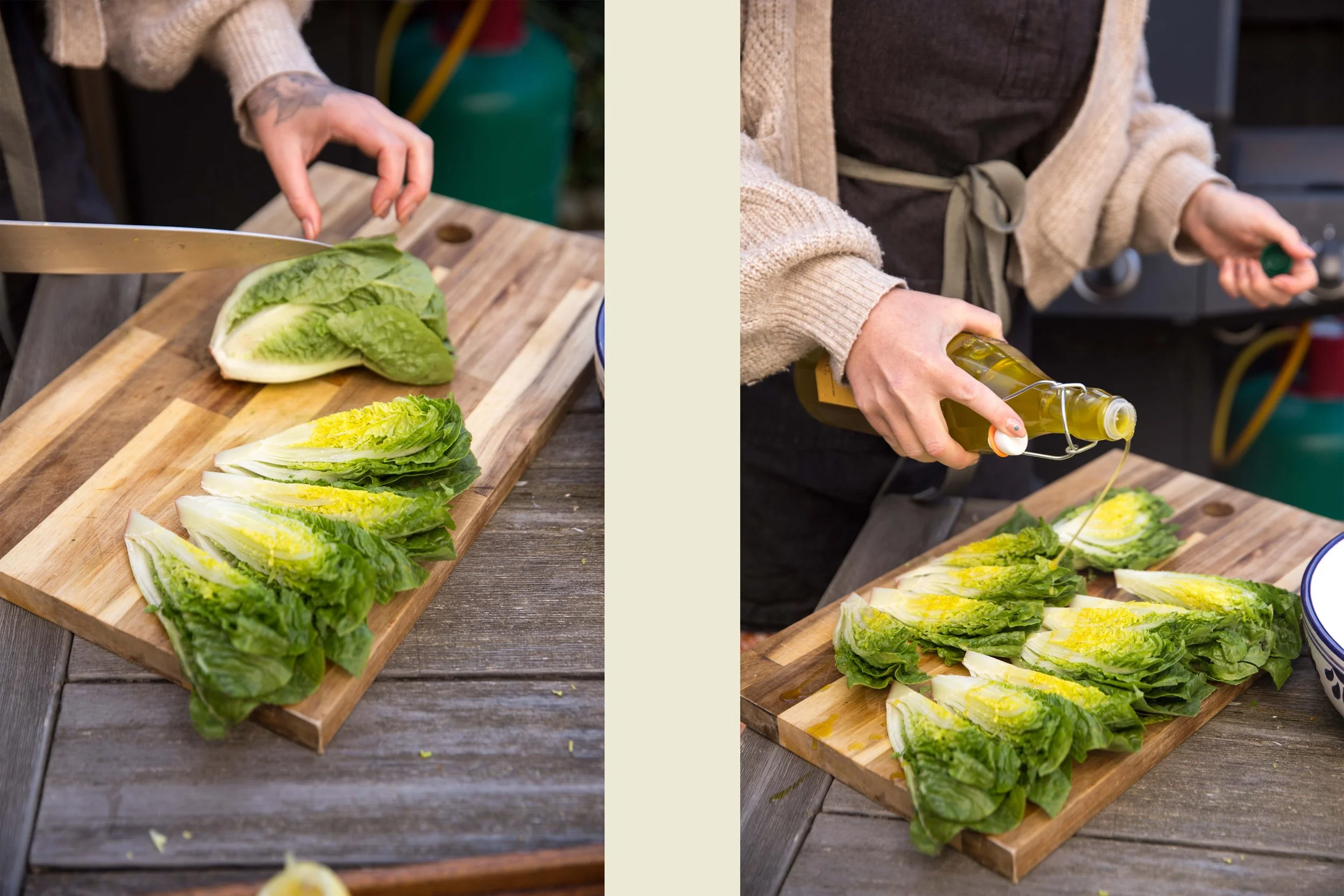 Chop the baby gem lettuces into quarters, and drizzle with olive oil