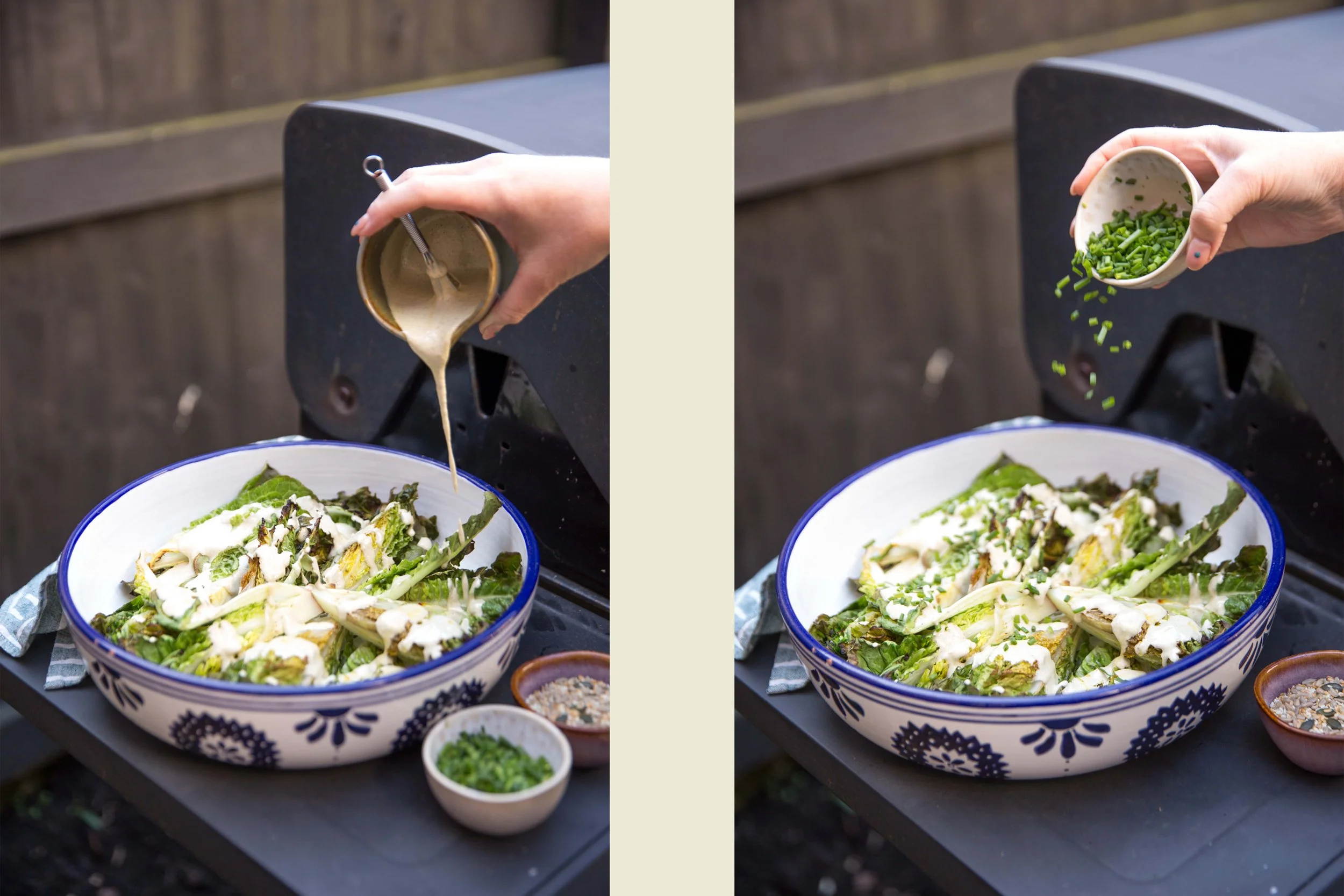 Take the lettuce off the BBQ and add to a shallow serving dish. Drizzle the dressing on top, and top with chives and sesame seeds.