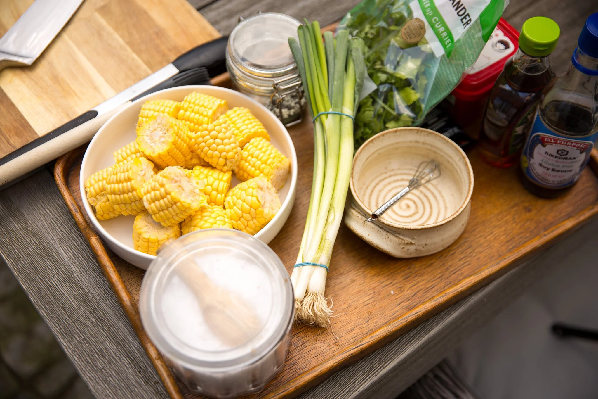 Start by chopping your 4 cobs into 4 smaller cobs giving you 16 bitesize corn pieces.