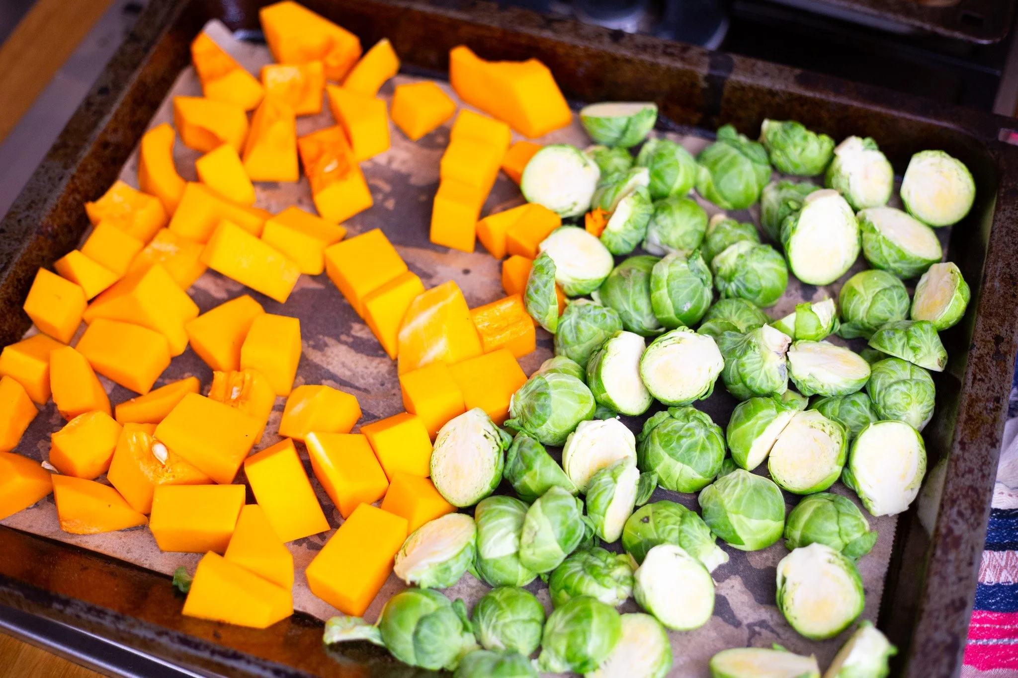 Start by chopping the sprouts in half and the squash in 2 cm cubes and add to a baking tray. Season with salt, pepper and drizzle with olive oil and mix well to ensure coated.