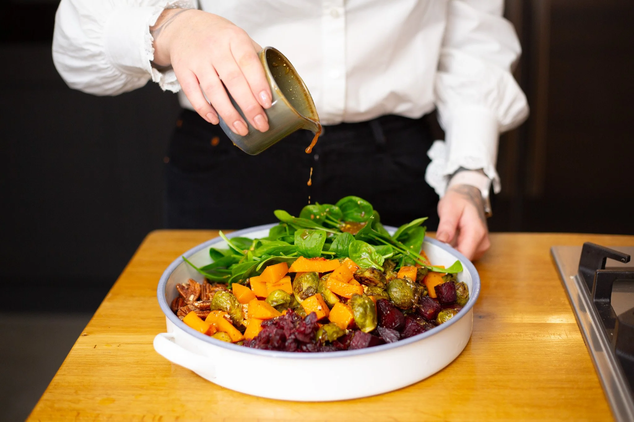 Add the roasted sprouts, squash and beetroot to a serving bowl along with spinach, pecans, cranberries.