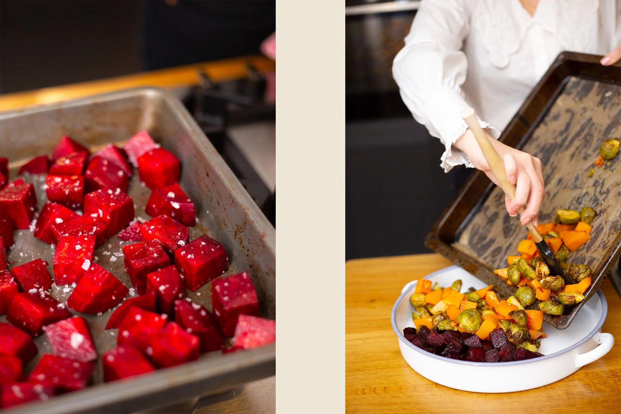 Chop the beetroot into 2 cm cubes and add to another baking tray. Season with salt, pepper and drizzle with olive oil and mix well to ensure coated.