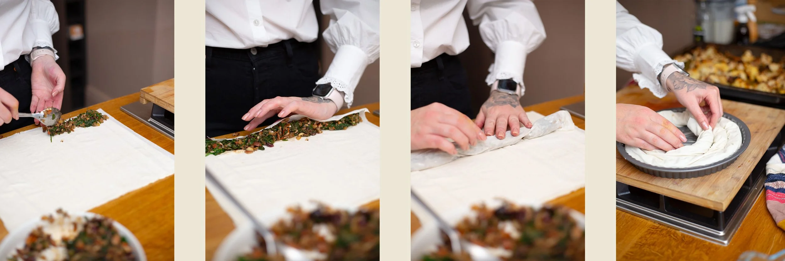 Lay your filo pastry onto a chopping board with the longest edge against your body. Spoon 1/6 of the stuffing mixture along the longest side of the pastry about 3cm thick, along the entire long side. (see images above)
