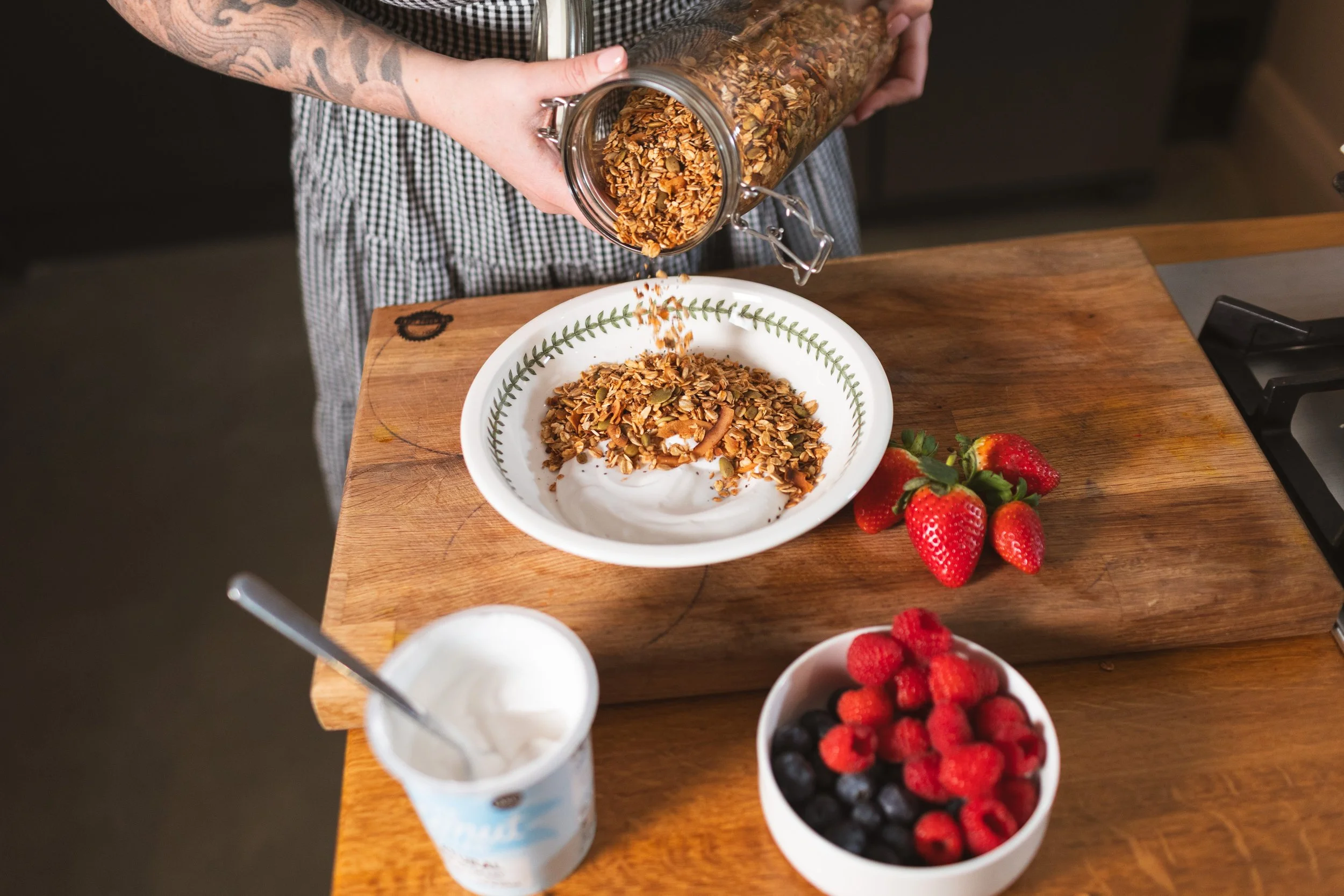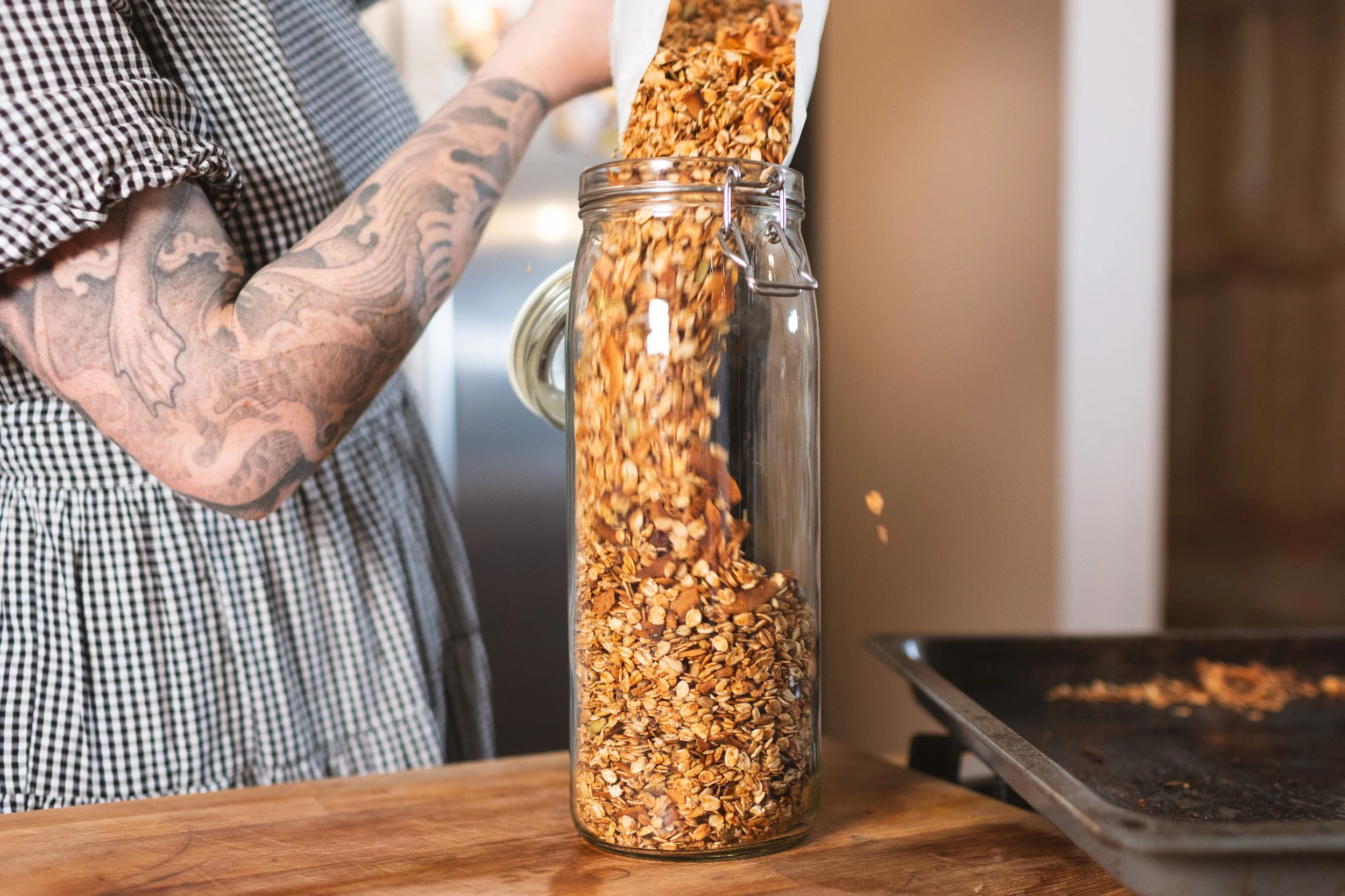 Load into a large jar or tuck in straight away! Great in granola bowls, as toppings to banana bread or pancakes.