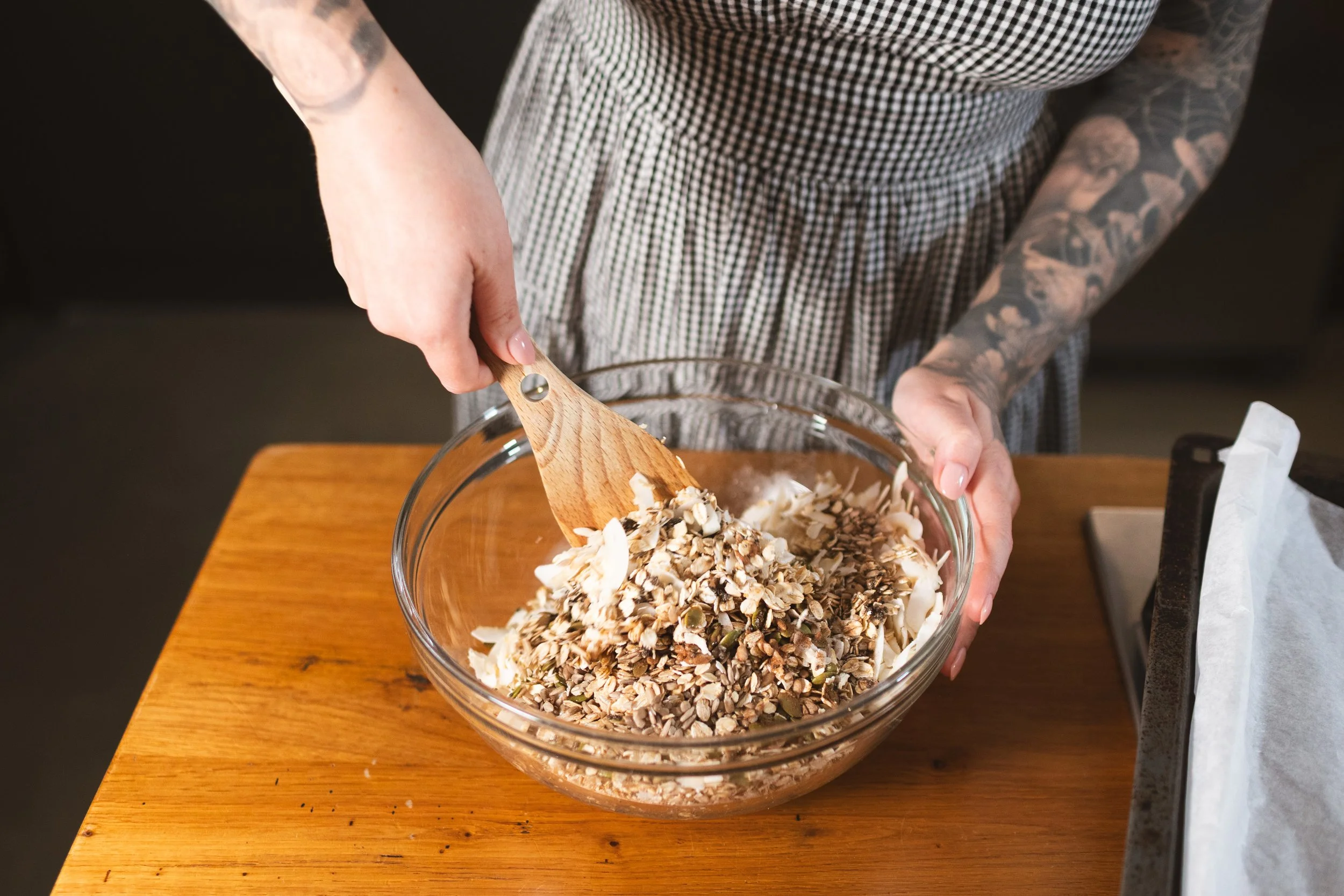 It’s a simple mix of oats, pumpkin seeds, sunflower seeds and chia, gently spiced with cinnamon and folded through with coconut flakes.