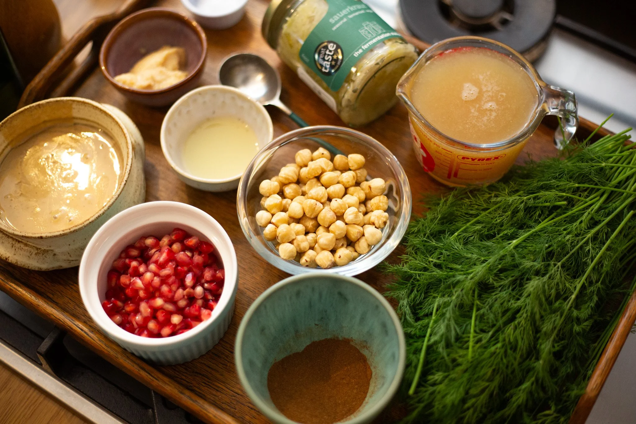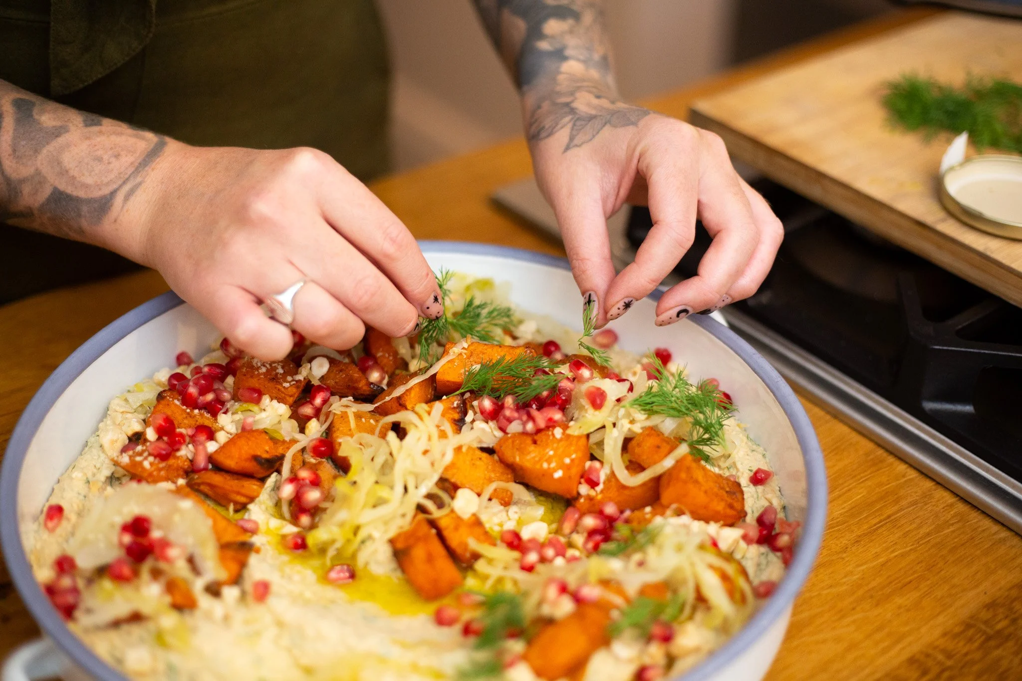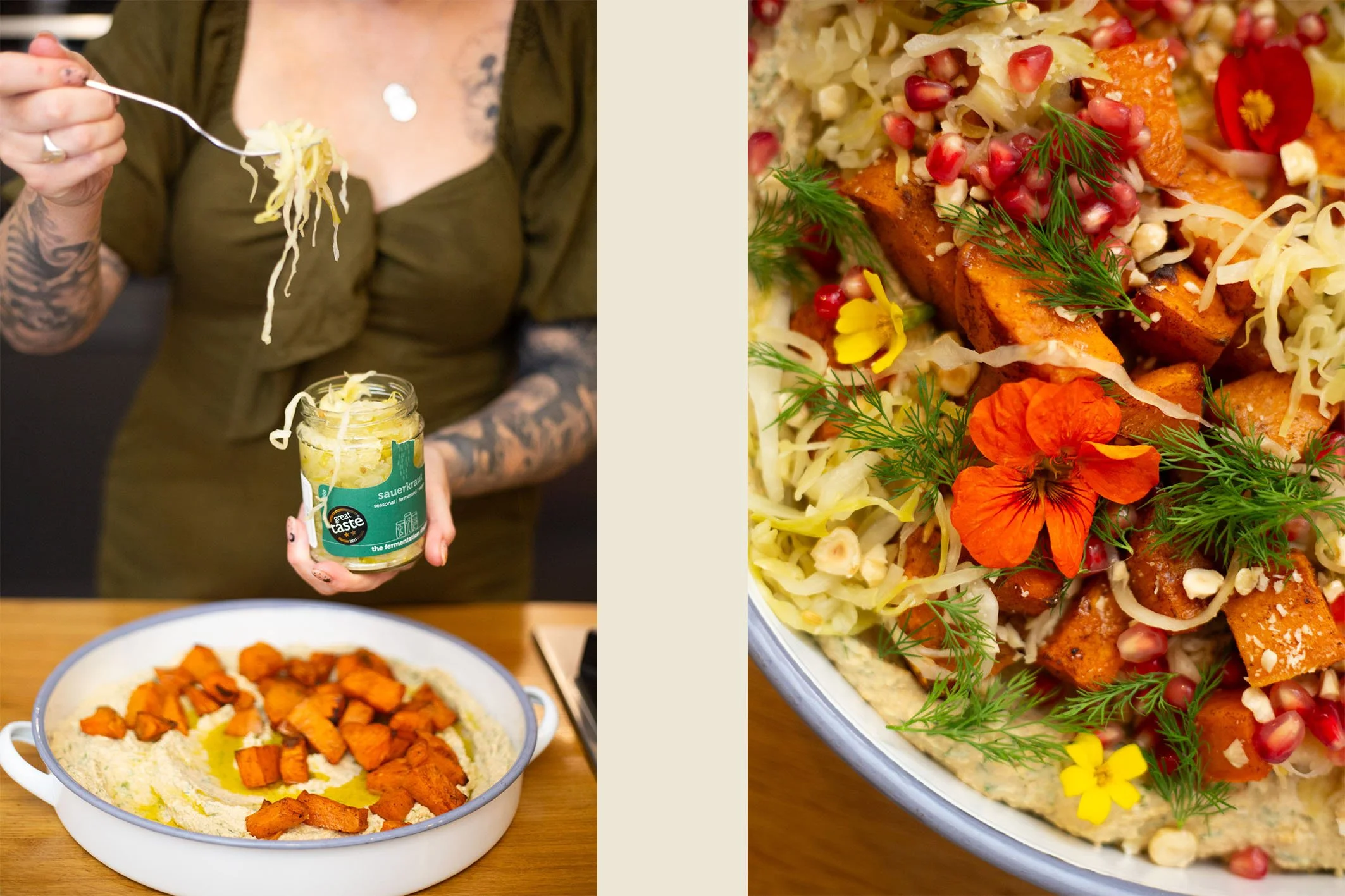 Time to load up! Add toppings of your choice, we recommend cinnamon roasted sweet potato, The Fermentation Station Sauerkraut, crushed hazelnuts, pomegranate seeds, fresh dill and edible flowers.